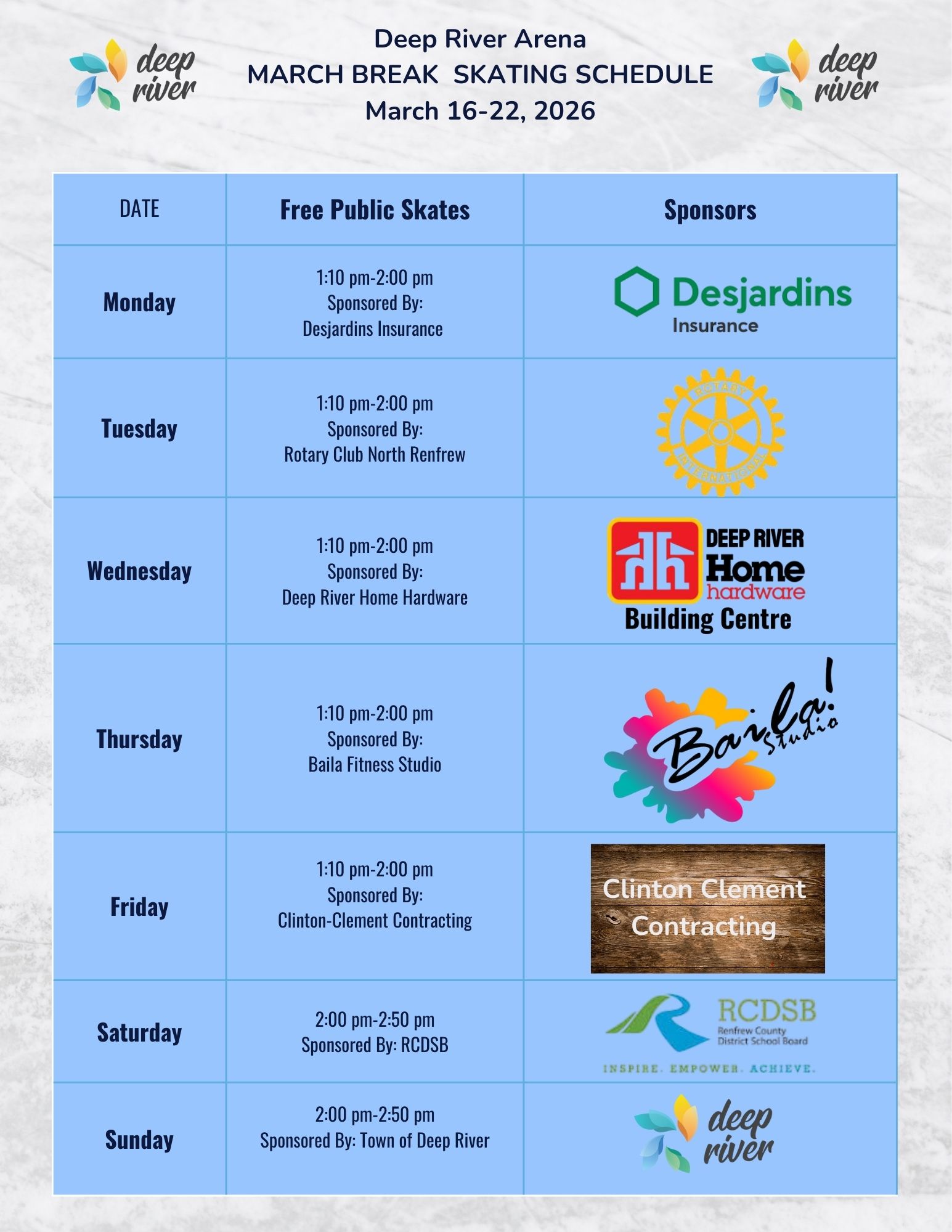 Recreational skating is available during the winter months on a weekly schedule. Please note: During Christmas Holidays and March Break the timing of Public Skates are subject to change.