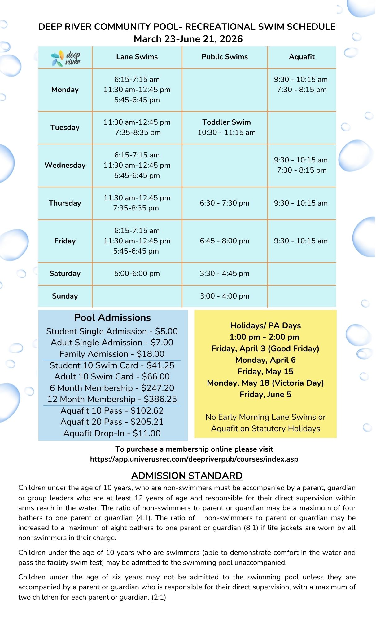 The Deep River Community Pool offers a wide variety of aquatic programs and services for all ages and skill levels. Year-round pool users can enjoy swim lessons, recreational swimming, aquatic fitness programs and leadership & lifesaving courses!