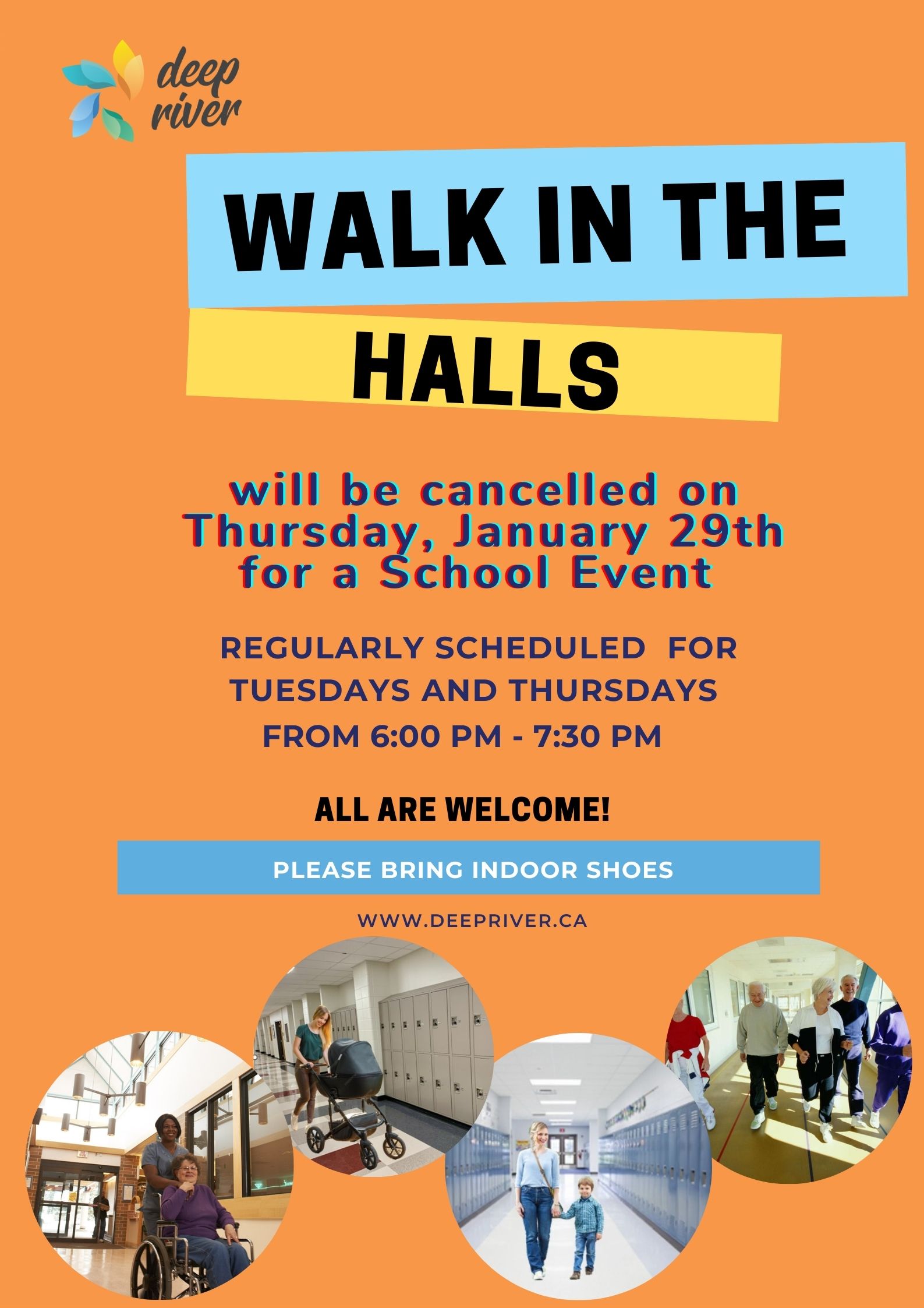 Due to an event at Mackenzie Community School, the Walk in the Halls program will be cancelled on Thursday, January 29th from 6:00–7:30 p.m.