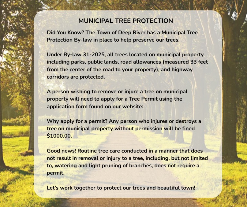 In accordance with by-law 31-2025 all provisions of this section will apply to all trees located on municipal property, including parks, public lands, road allowances, and highway corridors within the jurisdiction of the Town of Deep River.