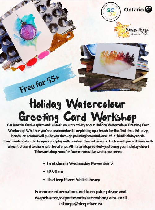 Learn watercolour techniques, play with holiday-themed designs (think snowflakes, wreaths, Ornaments, and more!). Each week you will leave with a heartfelt card to share with loved ones. All materials provided—just bring your holiday cheer!